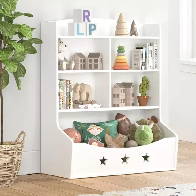 With a child-friendly height, this bookshelf allows kids to easily access and organize their favorite books and toys without assistance. Its modern grey and white color scheme blends seamlessly with various room styles, making it a stylish yet functional choice for any home.