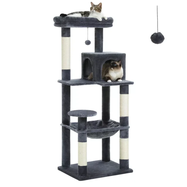 This cat tree is not only a play area but also a home for your cat to feel secure and entertained. Its multi-level design offers variety – your cat can choose from multiple cozy spots to rest or scratch. The large hammock is perfect for larger cats, making sure that even the fluffiest of felines have a place to relax. The top perch gives your cat a sense of control, letting them observe their surroundings, while the cozy condo offers a quiet retreat.