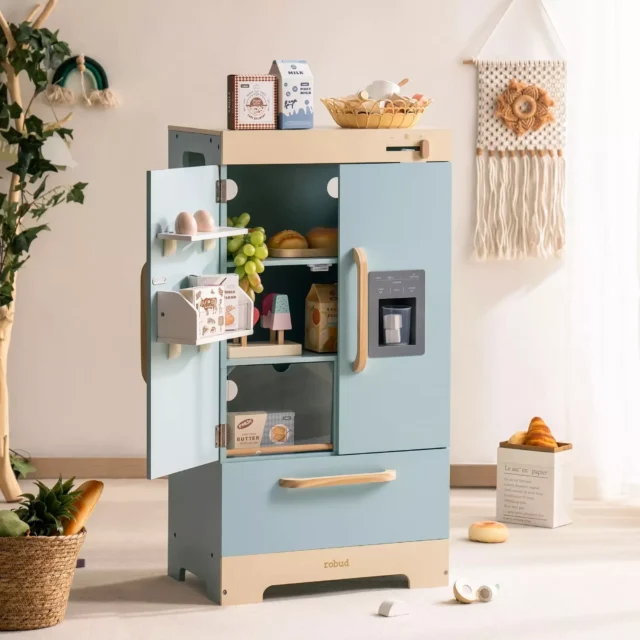 Transform your child’s playtime into a fun, hands-on learning experience with this beautifully designed wooden toy refrigerator. Complete with a working ice dispenser, fridge and freezer compartments, and a bright blue finish, this playset encourages little ones to explore, imagine, and engage in everyday kitchen adventures. Perfect for children aged 3 and up, it’s designed to spark creativity and help develop essential life skills through pretend play.